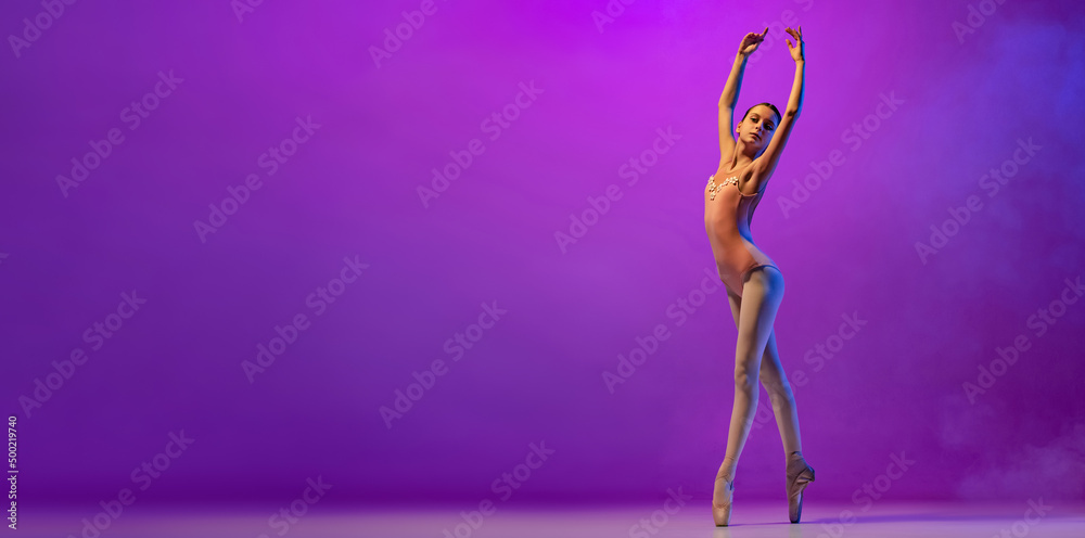 Beautiful flexible young female ballet dancer, teen in stage outfit and pointes dancing isolated on purple background in neon light with smoke. Art, grace, beauty. Flyer