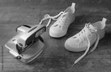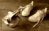 Snapshot of the nineties. An old camera and white children sneakers on a old textured wood background. Concept - memory of 90th