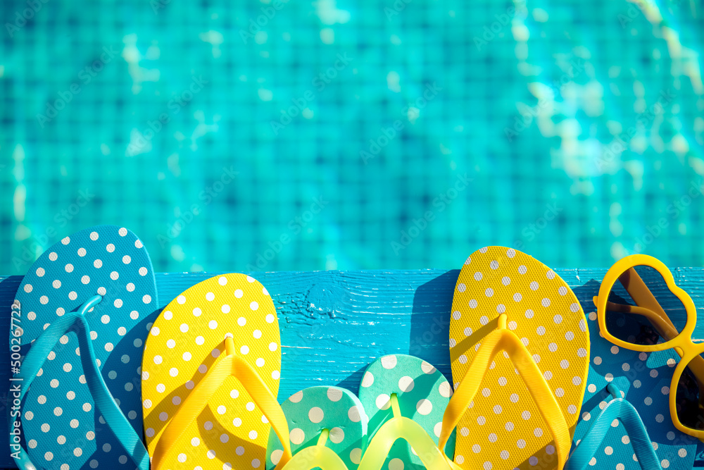 Beach flip-flops and sunglasses on blue wood against water background