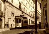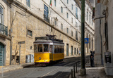 A typical vintage style public transport tram on the winding tracks in a street in Lisbon, Portugal.