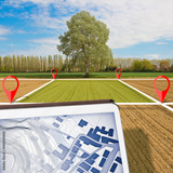Land plot management - real estate concept with a vacant land for building construction and housing subdivision in a residential area - Digital tablet on foreground with an imaginary cadastral map