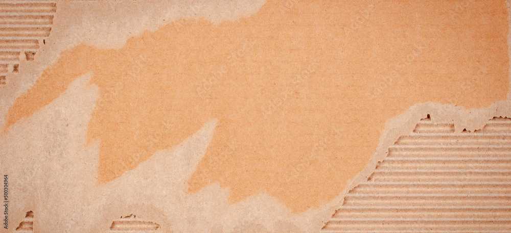 Brown corrugated cardboard with torn edges. Cardboard packaging mesh texture background. Top view, copy space