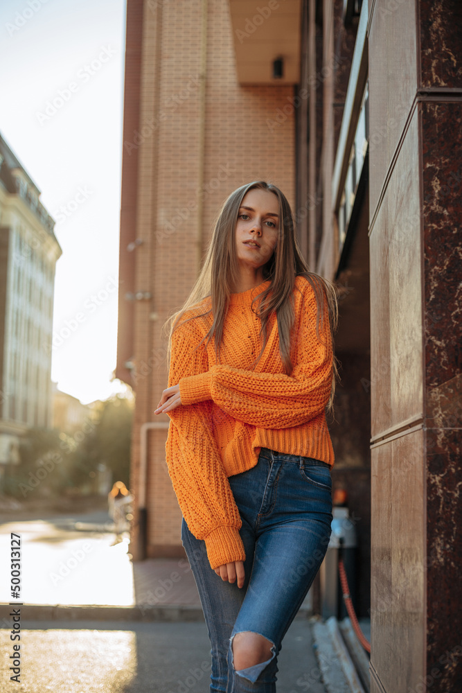 romantic young woman standing on the city street and looking at camera. Female model wearing warm knitted sweater and blue ripped jeans