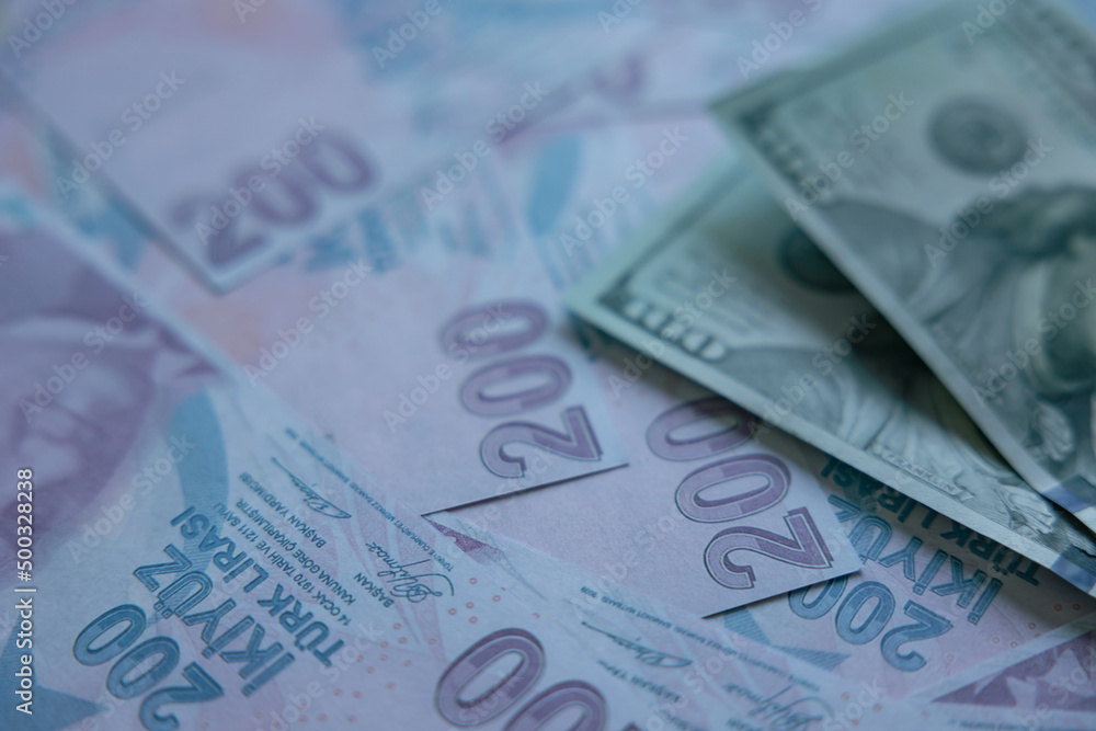 Economy of Turkey concept photo. US dollars on the Turkish liras.