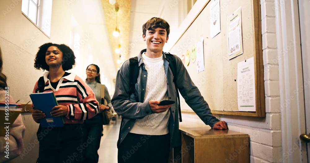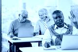 A multicultural group of senior students is learning about social media on laptops in the classroom.