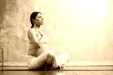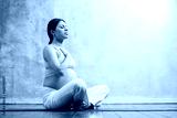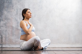 Young pregnant woman doing yoga exercises and meditating at home. Health care, mindfulness, relaxation and wellness concept.