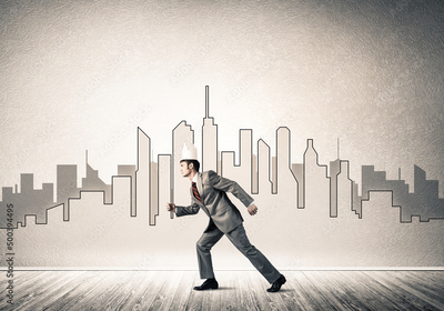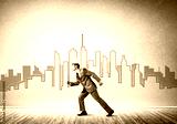 King businessman in elegant suit running and drawn cityscape silhouette at background