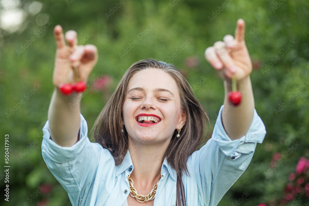 Beautiful young woman with dark hair is having fun in nature. Girl holds ripe berries in hands.