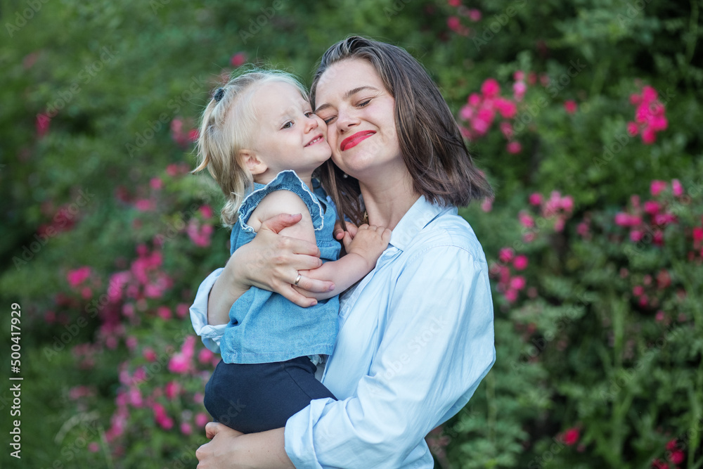 Mom holds toddler daughter in her arms. Gentle hugs of mom. Rest in the park in the spring.