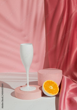 Wine glass with fresh orange fruit, tropical palm leaf shadow and podium on pastel pink background. Summer drink minimal concept. Suitable for Product Display.
