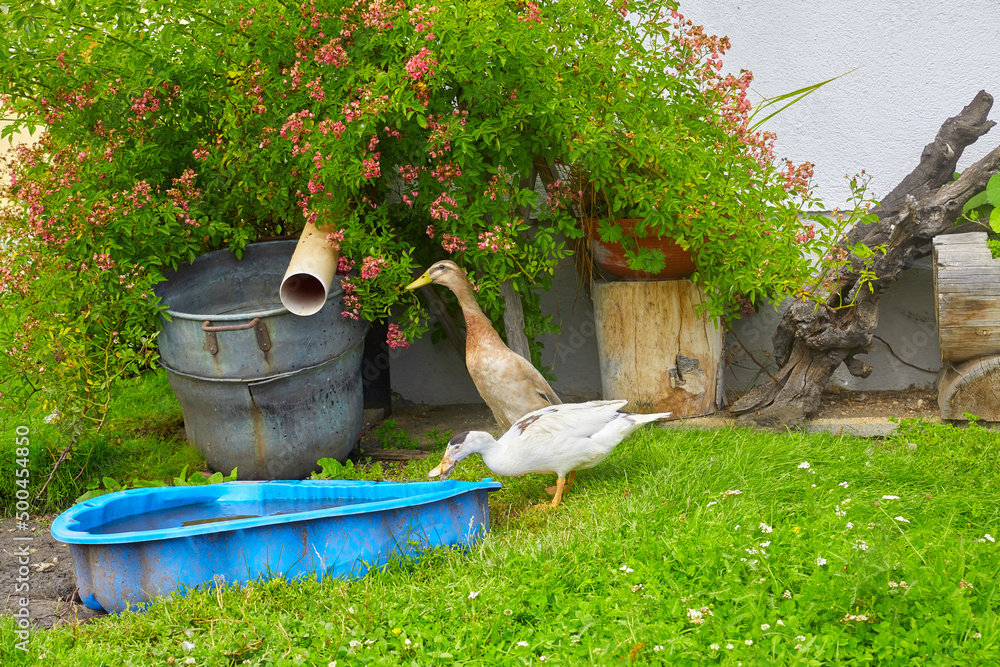 Kleines Entenparadies auf einem Bauernhof in Bayern, Deutschland.