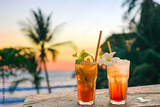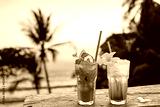 drinks with blur beach and sunset in background