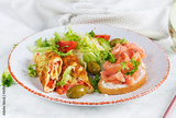 Breakfast. Omelette roll with tomatoes and sandwich with salmon on white plate. Lunch.