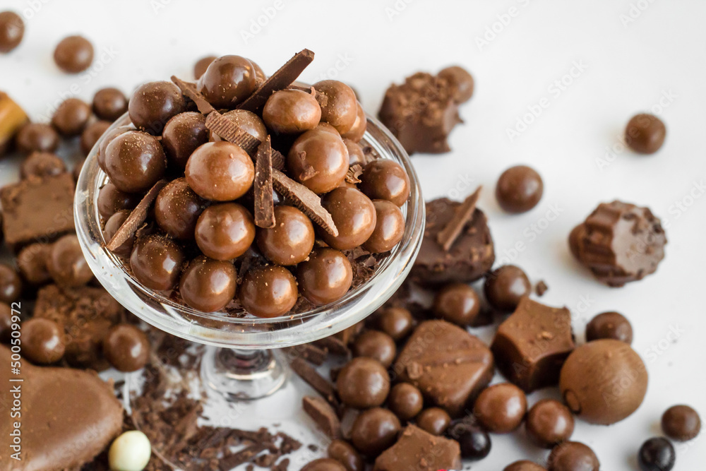 Milk chocolate covered hazelnuts with grated chocolate chips in an elegant bowl, with shaped chocolates on a white surface,