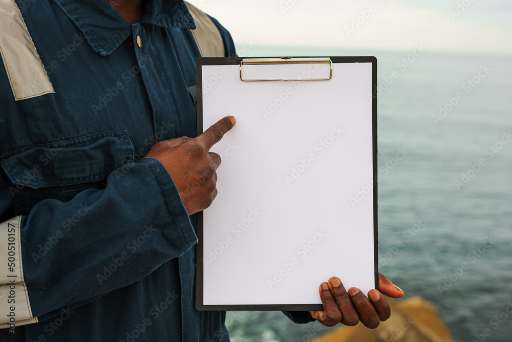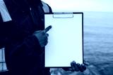 Seaman onboard a ship fills checklist. Paperwork at sea,