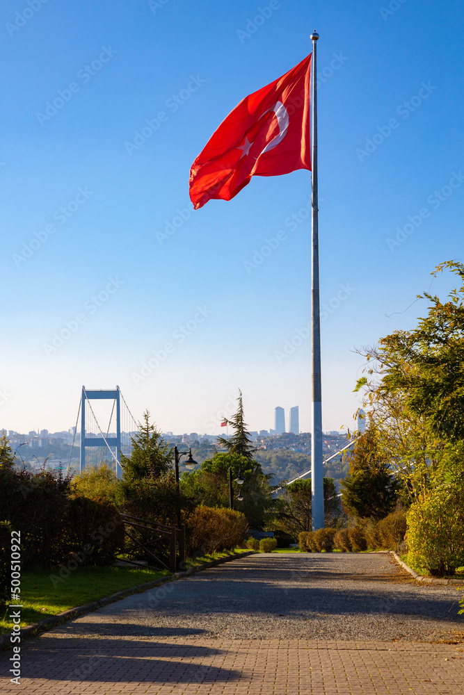 Turkish Flag and Fatih Sultan Mehmet Bridge on the background.