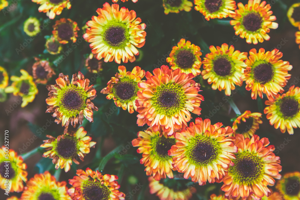 Beautiful colorful flowers of orange red and yellow in the garden field.