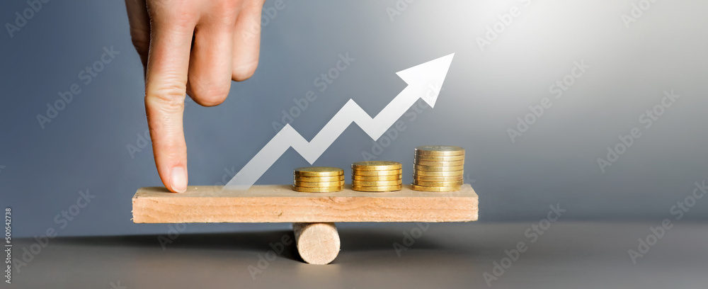 Financial Leverage And Money Balance. Finance And Price. Stacks of coins in a inflation chart and red arrow. Stack coin on wooden table with handwriting bar graph, dollar sign symbol and point up.