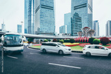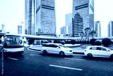 The bus goes under the skyscrapers in the city center