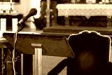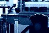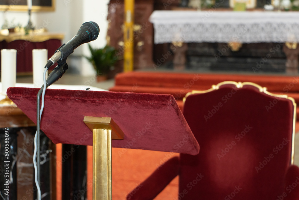 A microphone with a table for a speaker in a baroque church