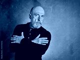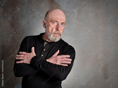 Head and shoulders portrait of a bald, bearded, thoughtful senior man in a black shirt