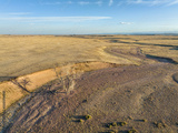 early spring on Colorado prairie - aerial view of grassland with a meandering dry stream, a lonely tree and cattle trails