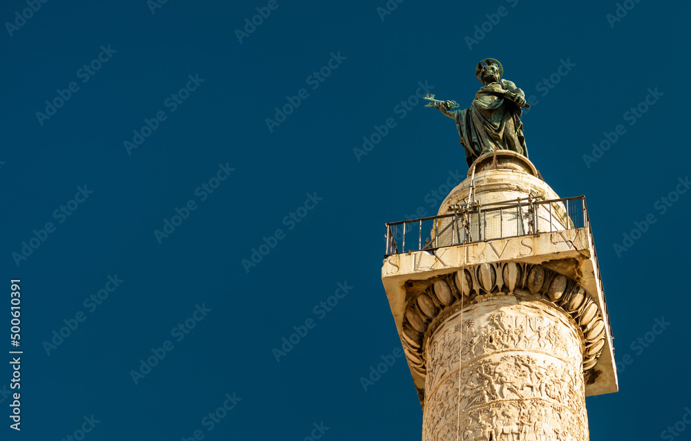 Apostle Peter statue on top of Trajan's Column, Rome, Italy. Sky background.