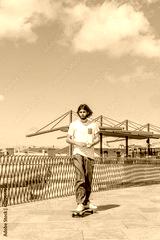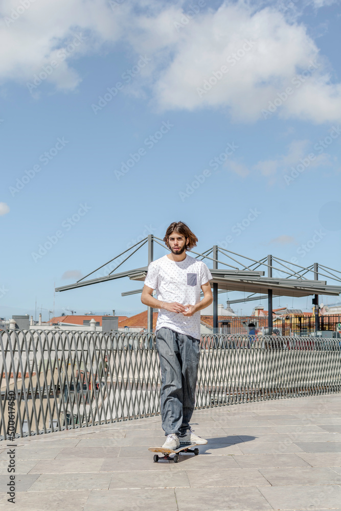 Young hipster practicing skateboarding in park in the street. Copy space,
