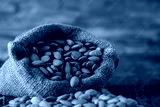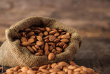 Almonds in sack bag on wood table.organic raw material