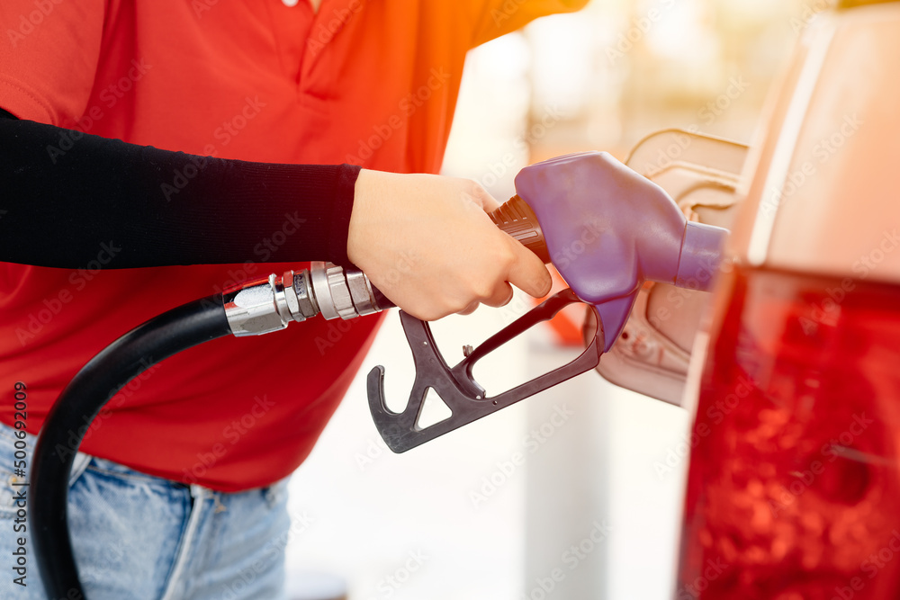 closeup stuff handle gasoline fuel nozzle to refuel. Vehicle fueling at oil gas station with high price concept.