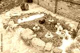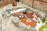 Garden arrangement with wood logs, wicker baskets, gravel and various ornaments