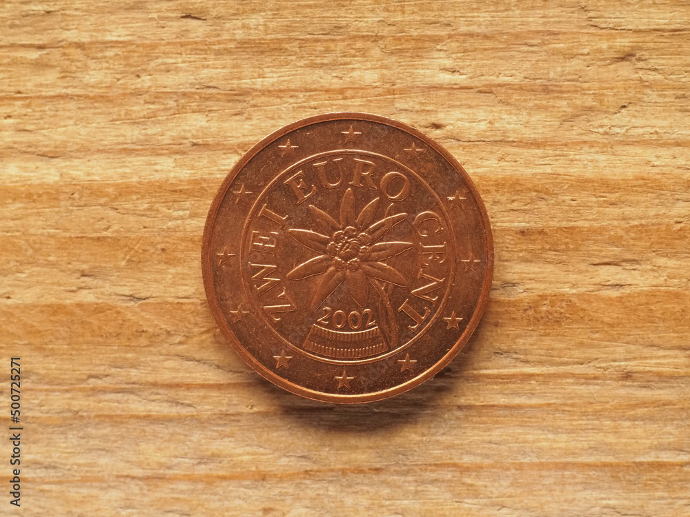 2 cents coin showing Edelweiss flower, currency of Austria, EU