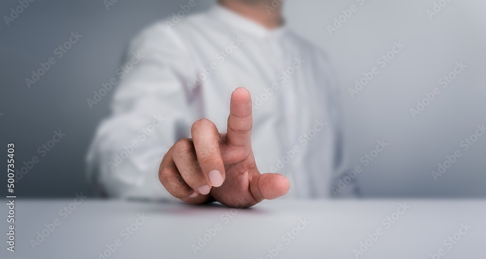 Finger touch on virtual touch screen gesture by business person in white shirt sitting behind the white table on grey background. Hand point or press on empty space by businessman' hand.