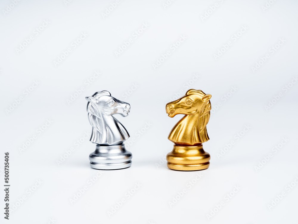 The confrontation between golden and silver horses, knight chess piece standing together isolated on white background. Leadership, partnership, competitor, competition, and business strategy concept.