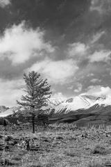 Autumn in mountains. Lonely standing tree and mountain range under blue sky.