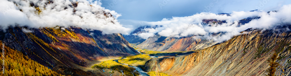 Top view of mountain valley. Mountain peaks are covered with clouds. River flowing through a canyon. Design idea for kitchen glass back wall.