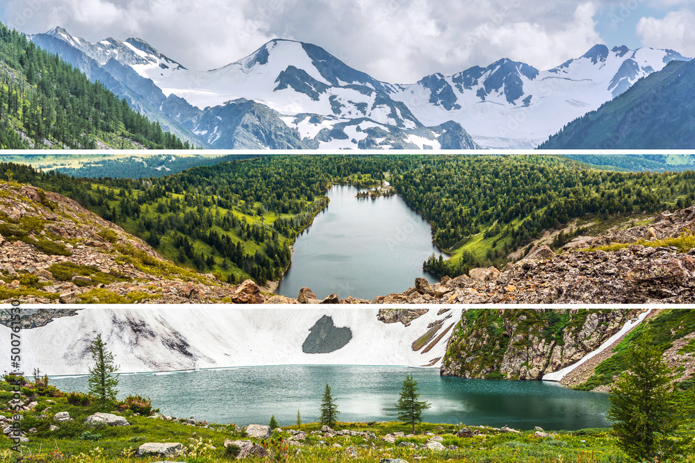 Nature of the Altai Mountains. Landscape photo collage with beautiful views of mountains and lakes. Travel destinations.