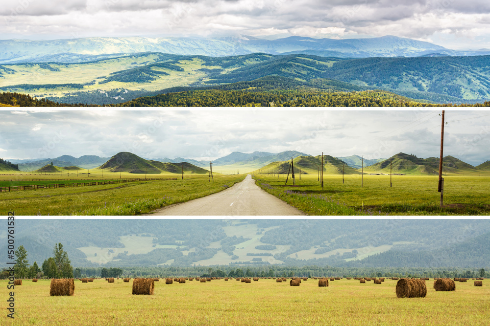 Nature of the Altai Mountains. Landscape photo collage with beautiful views of mountains and meadows. Travel destinations.
