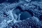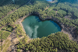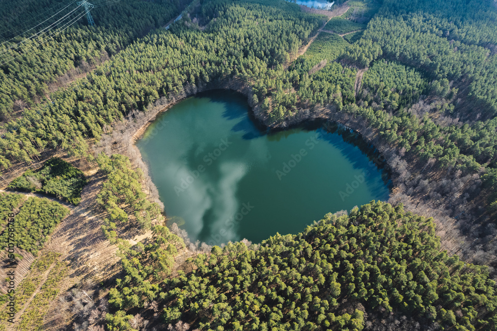 Heart shaped lake in the middle of the forest in a place in Mazury, Poland. Concept of ecology, renewable energies and environmental protection against climate change.