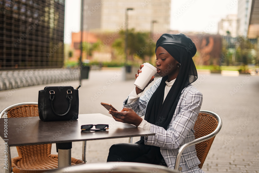 Black elegant woman drinking coffee and browsing smartphone