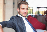 Portrait of happy young businessman sitting on sofa in hotel lobby