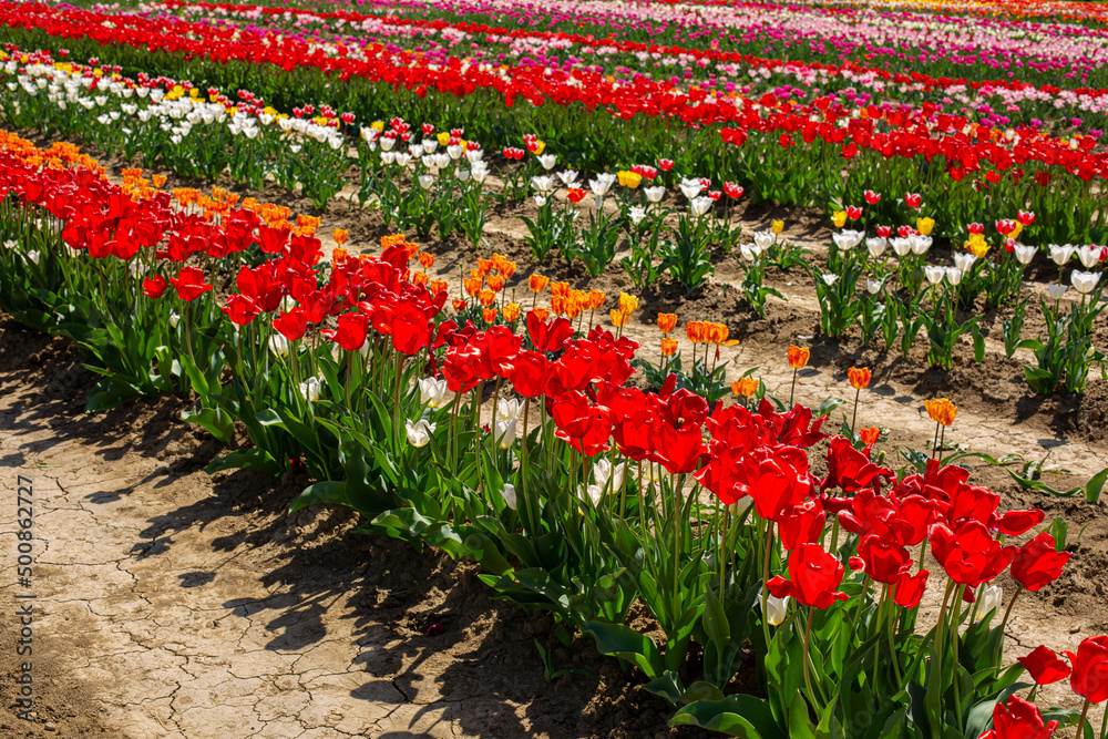 Variety of tulips in Bulb fields. Colorful. Diagonal. Italy. Bologna.