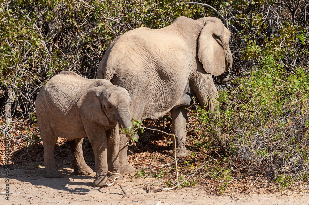 Closeup of two African Desert Elephant - Loxodonta Africana- wandering in the desert in North Western Namibia.