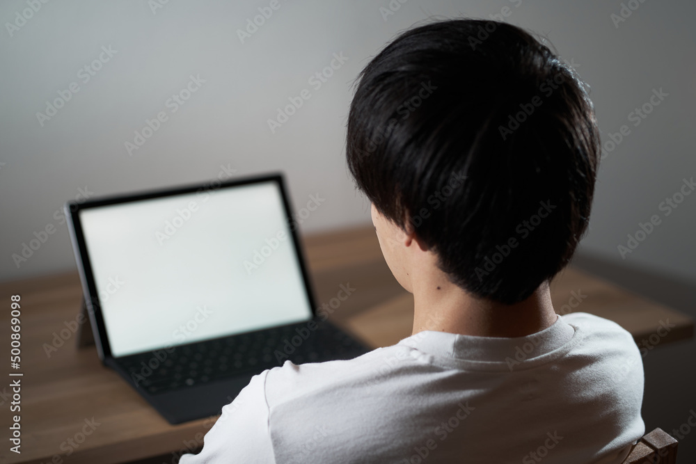 夜中にノートパソコンに向かうアジア人男性