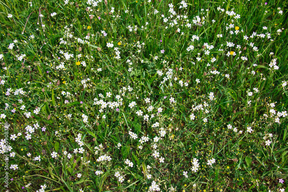 Green field grass with white flowers, top view.