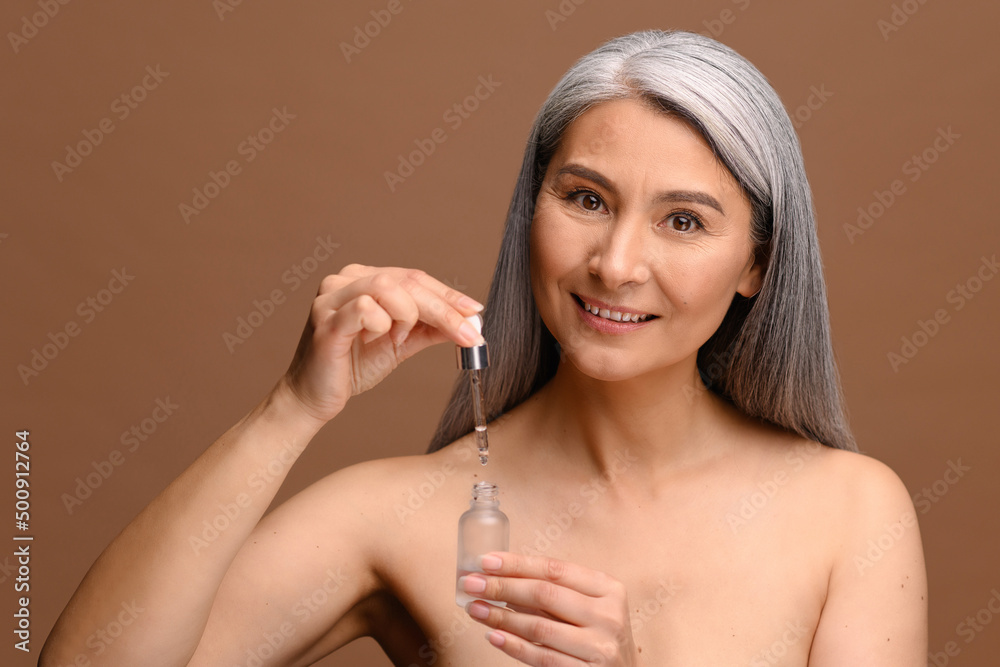 Portrait of a beautiful Asian middle aged woman with grey hair holding bottle with cosmetic oil or rejuvenation serum isolated on beige brown background, 50s female advertising cosmetology product