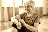 sport, fitness and healthy lifestyle concept - smiling senior woman with smart watch or tracker exercising at home