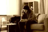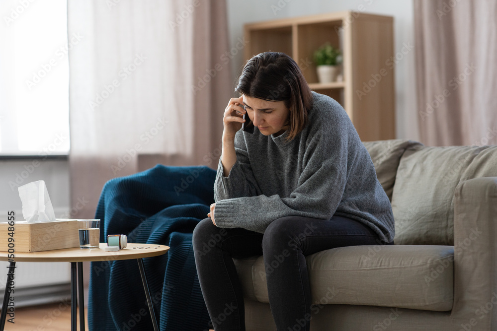 mental health, psychological help and depression concept - stressed woman with sedative medicine on table calling on phone at home