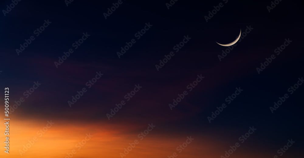 Crescent moon on dusk sky twilight religion of Islamic and free space for text Eid Al Fitr, Eid Al Adha, Muharram