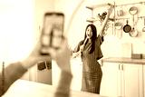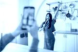 Hand of female with smartphone shooting happy asian woman dancing at home when making video for social media, Stories and vlog concept.